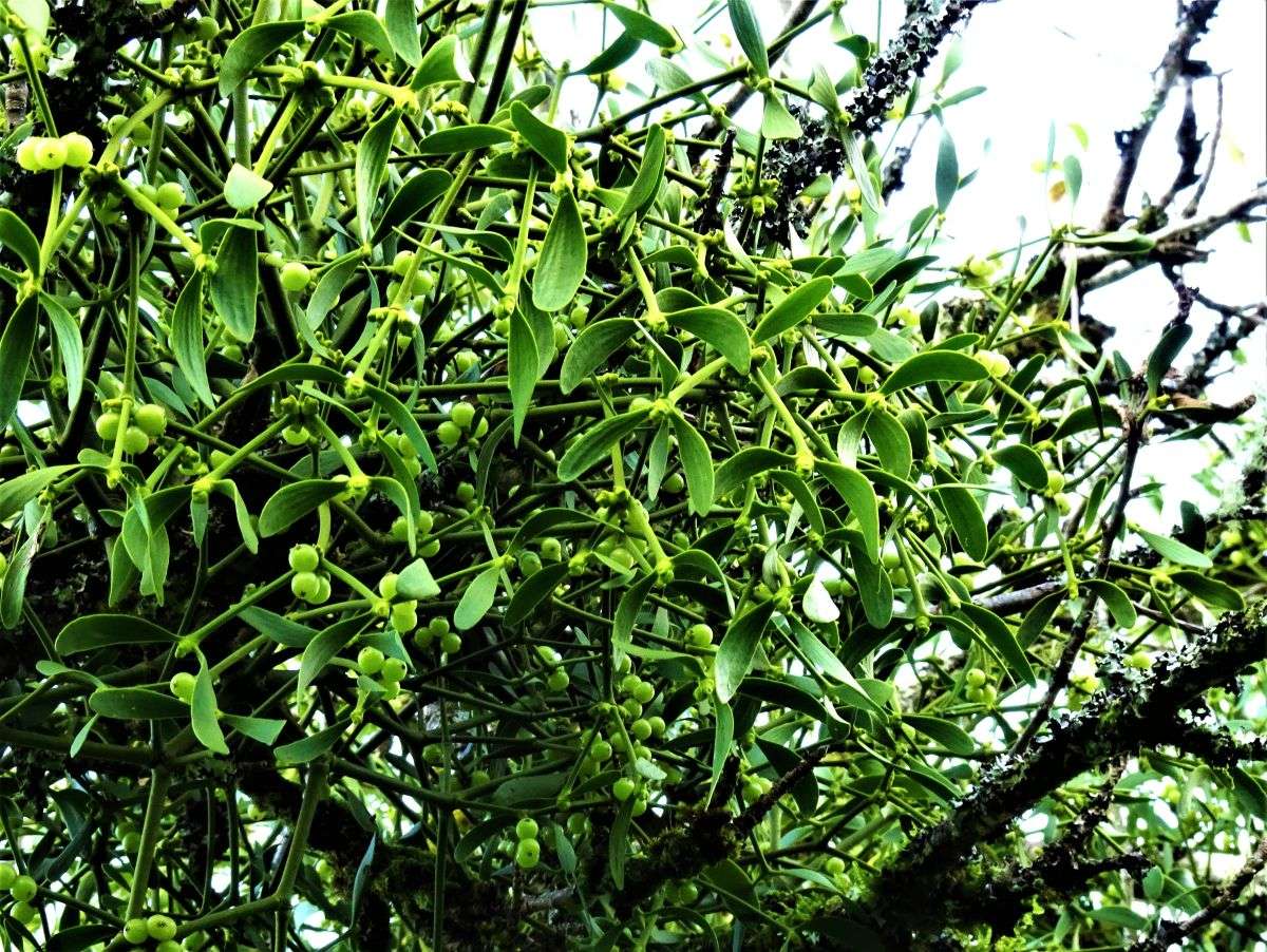 A few winters ago, I was elated to see Mistletoe flourishing on bare gnarled apple tree branches in a local orchard. Although the pearl-like berries and satin foliage are poisonous to humans and pets if ingested, they make a great feast for birds, the shrub’s seeds being spread through their droppings.